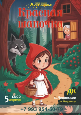 5апреля в 12:00 Ленинский Дом Культуры и театр сказки "Лукоморье" приглашают на музыкальный спектакль по мотивам сказки Шарля Перро "Красная шапочка" (0+)