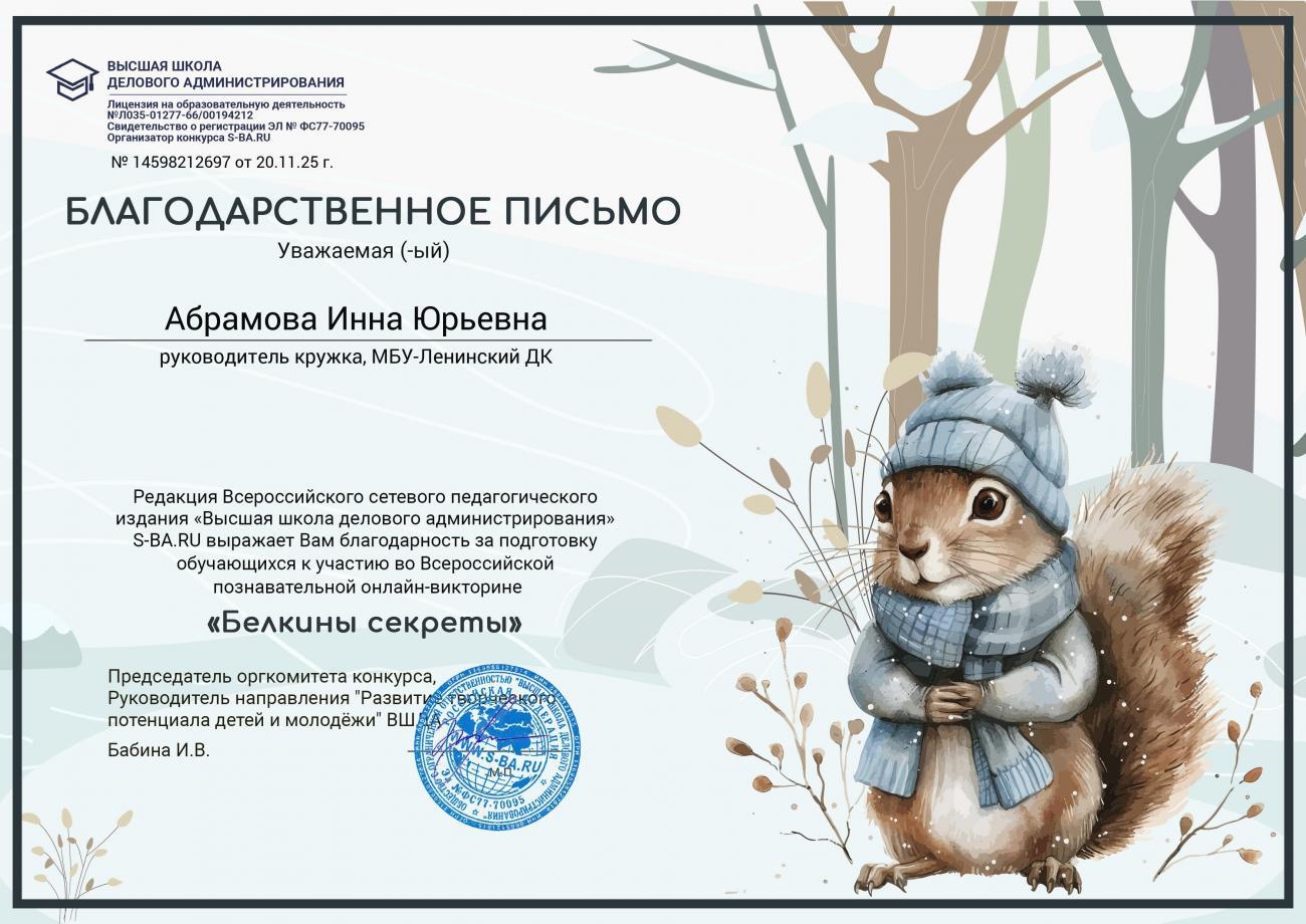 Поздравляем ребят с успешным прохождением Всероссийской познавательной онлайн - викторины "Белкины секреты", призванной привлечь внимание к необходимости бережного отношения к природе и её обитателям.