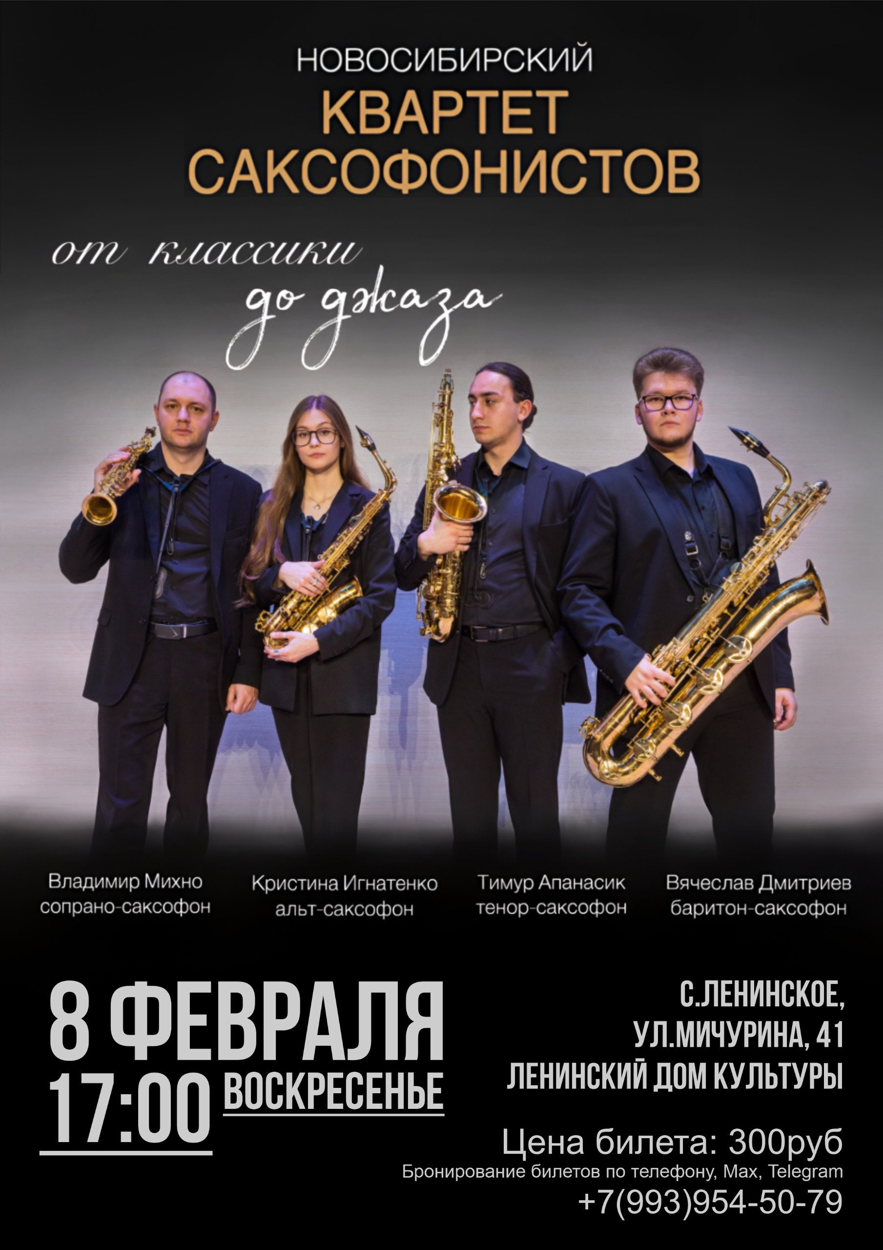 8 февраля в 17:00 приглашаем вас погрузиться в незабываемое музыкальное путешествие — на сцену выходит "Новосибирский квартет саксофонистов", чьи выступления покоряют слушателей глубиной звучания и виртуозностью исполнения!