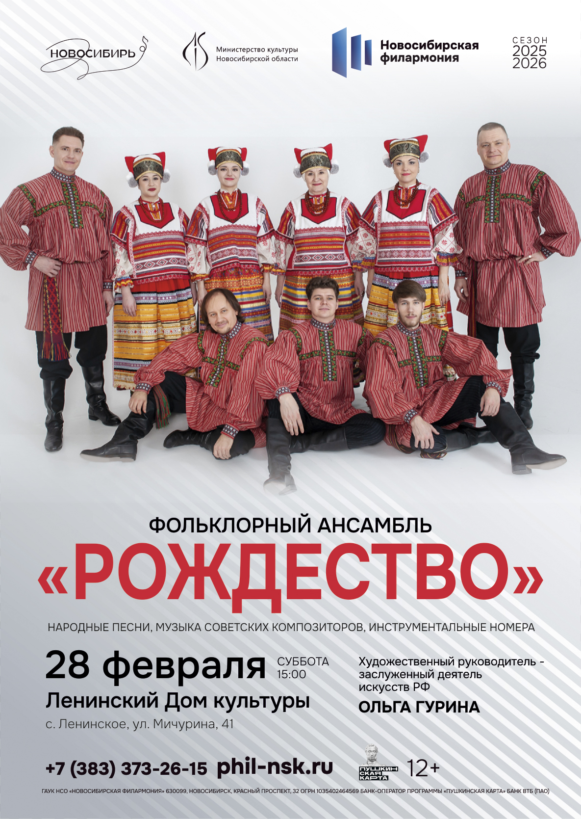28 февраля в 15:00 в Ленинском Доме Культуры (с.Ленинское, ул.Мичурина, 41) концерт фольклорного ансамбля «Рождество» (Новосибирская филармония). Ведущая – Анна Гурина.