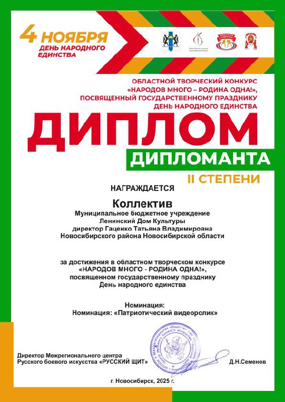 В октябре 2025 года Ленинский Дом Культуры стал участником Областного творческого конкурса «НАРОДОВ МНОГО-РОДИНА ОДНА!» в номинации "Патриотический видеоролик".