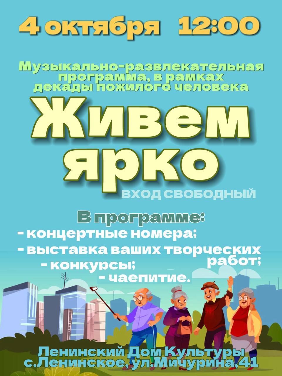 4 октября в 12:00 Ленинский ДК приглашает на музыкально-развлекательную программу, в рамках декады пожилого человека "Живём ярко".