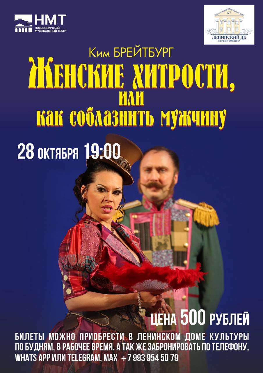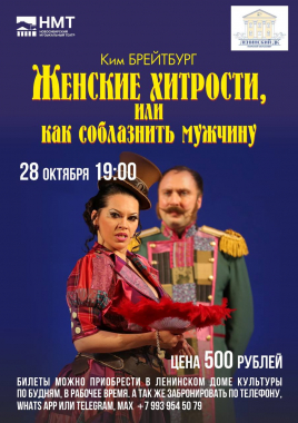 28 октября в 19:00 в Ленинском Доме Культуры Новосибирский музыкальный театр предлагает на суд публики новое детище Кима Брейтбурга и либреттиста Евгения Муравьева – самый настоящий и абсолютно классический водевиль «Женские хитрости, или Как соблазнить мужчину» (12+).